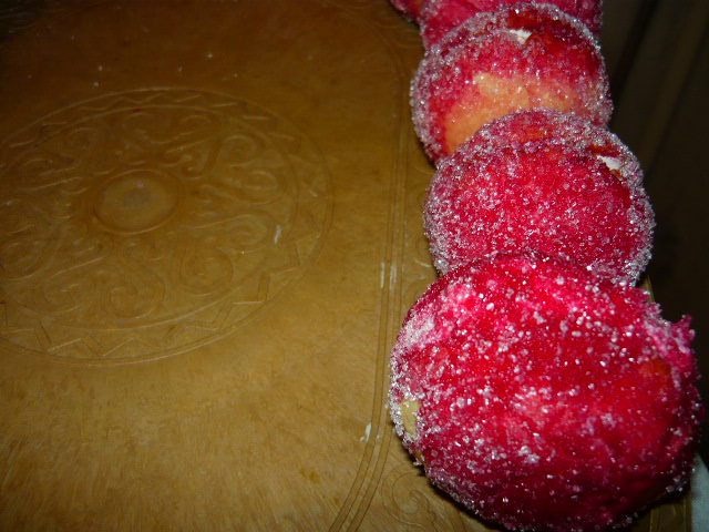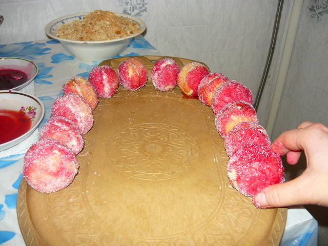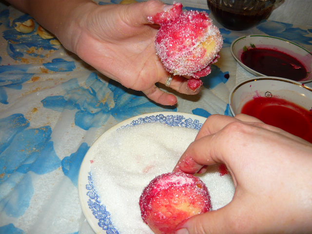 PenisEnlarger, не сплю ночами добавлено через 50 минут 1 порция (10шт). Тесто: Мука 400гр. Масло 100гр. Яйца 2шт. Сахар 100гр. Сметана 60гр.(2ст.л.) Сода Крем: Масло 200гр. Сгущенка 100гр. Крахмал В сахар добавить 1 яйцо и 1 желток, взбить. В отдельной емкости размягчить масло, добавить сметану, соду, взбить. К маслу добавить взбитый сахар с яйцами, все перемешать, взбить. Добавить муку, замесить тесто. Тесто раскатать колбаской и поделить на 20 частей, скатать шарики. Шарикам придать форму персика и выложить на противень (чуть смазанный маслом). Выпекать в теплой духовке. При готовности, верх будет белый, низ коричневый. Крем: Размягчаем масло, добавляем сгущенку, крахмал, взбиваем. Крем я убираю в холод, чтобы он немного загустел. при взбивании крема, добавляю свекольный сок, для окраски. Когда половинки персиков остынут, ножом вырезать у них углубления, аккуратно, могут ломаться. В углубление кладется крем, соединяются половинки, один бок обмакиваем в свекольный сок, другой в морковный, обваливаем всё пирожное в сахаре и на блюдо. Я их на некоторое время убираю в холодильник, чтобы застыл крем. Для сока овощи тру на мелкой терке и отжимаю через марлю, хватает небольшой моркови и свеклы. Когда есть орехи, кладу в серединку, типо косточка)) На фото у меня три порции)))