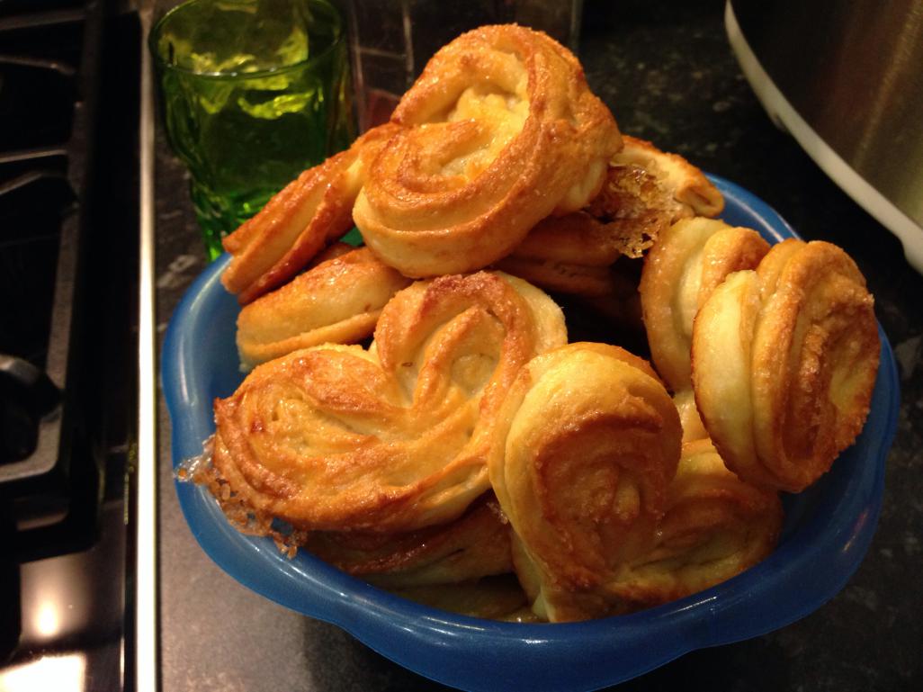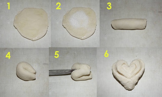 LOL, из теста в посте № 606 Наливаешь на стол немного масла, выкладываешь тесто, отщипываешь кусочек, пальчиками разминаешь в лепешку, посыпаешь сахаром, сворачиваешь трубочкой, трубочку пополам, надрезаешь и выворачиваешь сердечко. Кладешь на противень, смазываешь взбитым яйцом, в духовку. Когда готовы, горячие смазываешь сладкой сладкой водой.