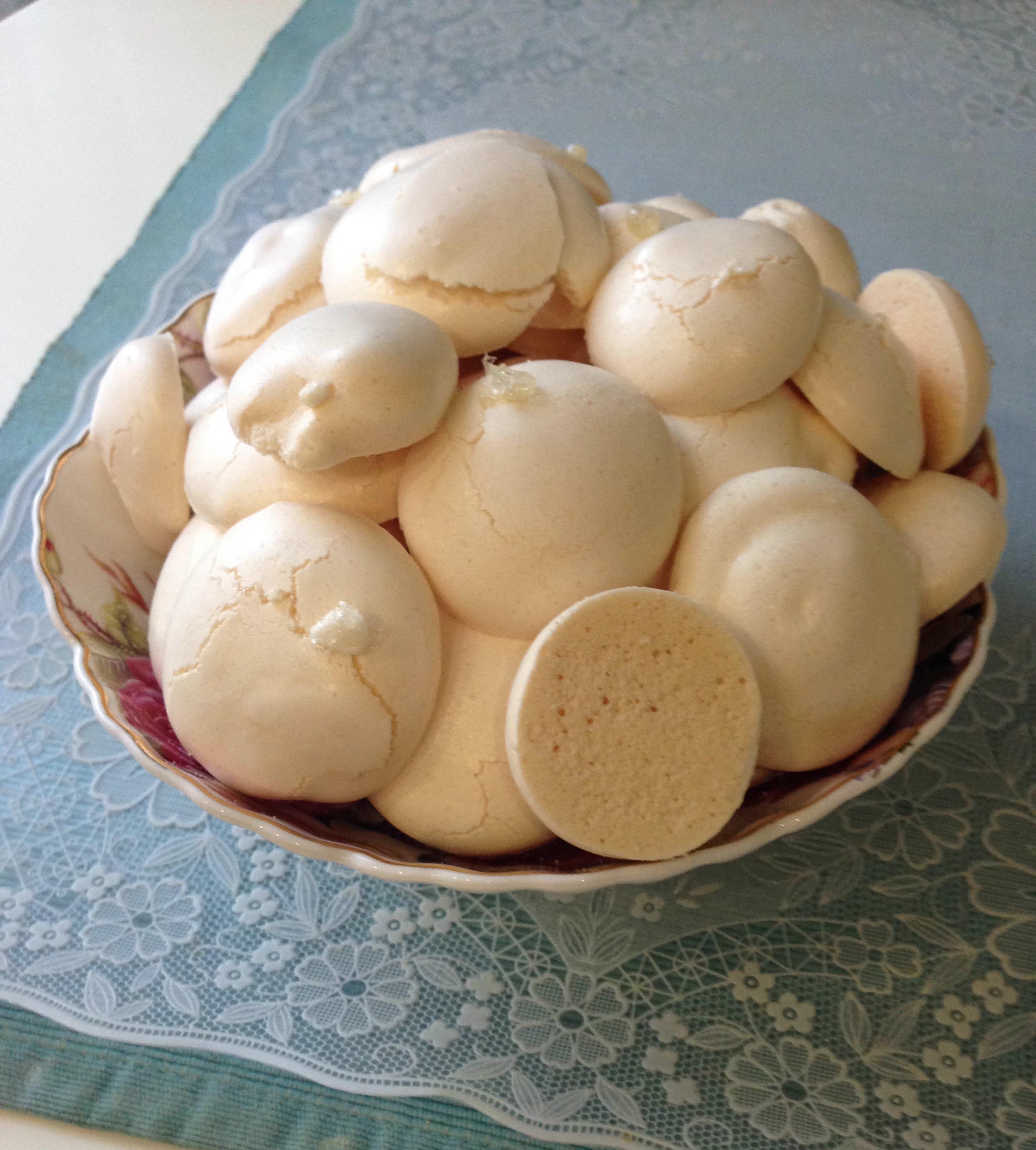 Безе пеку. Вчера белки остались от Посыпушки. 8 белков, добавить щепотку соли и взбивать в пену. Не переставая взбивать, добавлять сахарную пудру (по рецепту 400гр, я больше добавила, 600гр ушло), взбить всё в белую густую массу, чтоб не текла, а форму держала. Шприца и мешка кондитерского у меня нет, выкладывала на противень ложкой. На противень ещё надо положить бумага пекарскую. Выпекать 1 час при 100 градусах. У меня бумаги не оказалось, в магазин идти лень, смазала противень маслом.