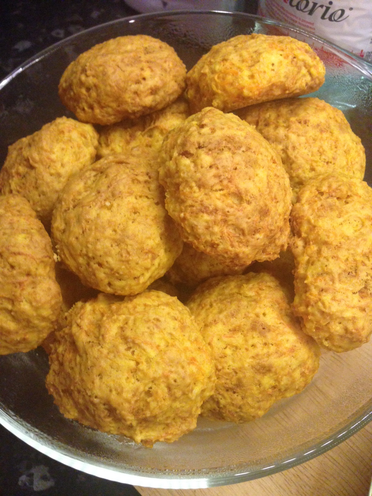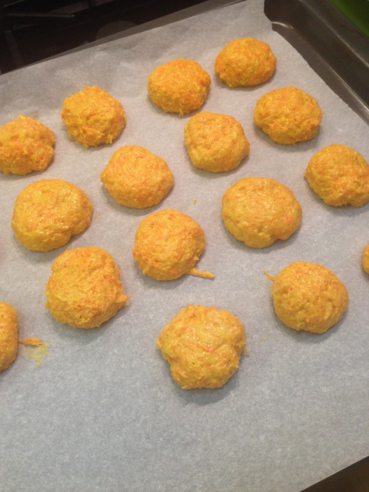Печенье морковное 1 стакан натертой на мелкой терке сырой моркови (из 250 грамм моркови) 150г сахара 100г сливочного масла 2 ч.л. разрыхлителя (или 1 ч.л. гашеной соды) 400гр муки Масло растереть с сахаром, добавить морковь и хорошо перемешать. Добавить муку и разрыхлитель, замесить тесто (получается мягкое). На противень положить бумагу для выпечки (или смазать маслом), руки чуть мочить и формировать шарики из теста выкладывая их на противень чуть придавливая (для придания формы). Поставить в разогретую до 180 градусов духовку и выпекать 20-25-30 минут. На вкус, ничего выдающегося. Но я и не любитель печенья. Но они из ингредиентов которые входят в список употребляемых мужем)