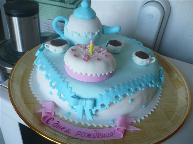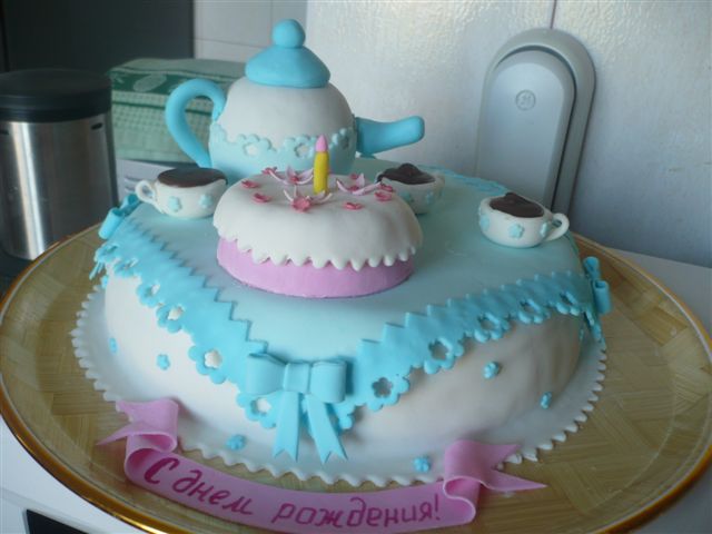 У дной моей знакомой намечался ДР. Знакомы мы совсем немного, у нас дочки вместе фигурным катанием занимаются. Решила я ей сделать тортик в виде стола со скатертью, чайником, чашечками и вазой с вареньем. Заранее сделала чашки и вазу, чтобы они посохли. Собрала торт, слепила чайник из пирожного картошка, обтянула мастикой. Иду за чашками с вазой и что я вижу? Моя драгоценная доченька вазу разбила!!!! Я в шоке! Уже ночь - утром торт надо дарить, мастика не высохнет Так и получился тортик без вазочки с вареньем... какой-то он пустой вышел.... В принципе можно посредине тортик сделать, бублики разбросать, еще мелочи какие-нибудь.. но у меня на это времени и сил не было
