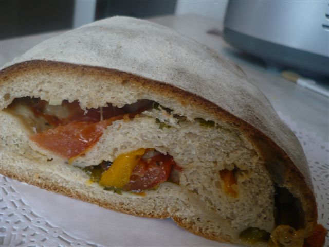 Хлеб по-деревенски с запечеными овощами С вечера ставлю закваску из стакана холоднючей воды, стакана ржаной муки (или муки грубого помола) и 1.5 ч.л. дрожжей. Затем добавляю 11 полных ст.л. пш. муки, 2ст.л. меда и 1.5.ч.л. соли. Тесто жидковатое и прилипучее. На стол насыпать немного муки. Выложив тесто, разделить его на 2 части. Руками разровнять в виде прямоугольника (ладошки постоянно "окунать" в муку). Выложить сплошным слоем помидоры, чеснок, оливки, базилик,перчик, присыпать дробленным перцем, сбрызнуть оливковым маслом. Овощи лучше предварительно запечь в духовке. Свернуть рулет, уложить в форму, в которой будет выпекаться хлебушек, накрыть пленкой, тяжелым махровым полотенцем и оставить на часок. Духовку разогреть мах, затем снизить до 200-230 С и поставить печься хлеб. .