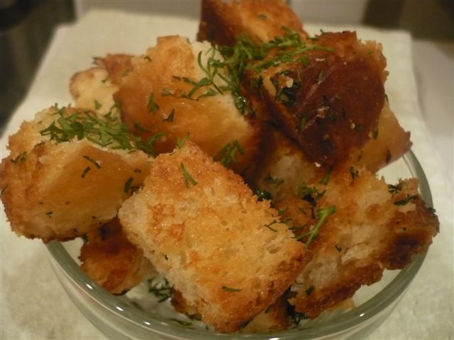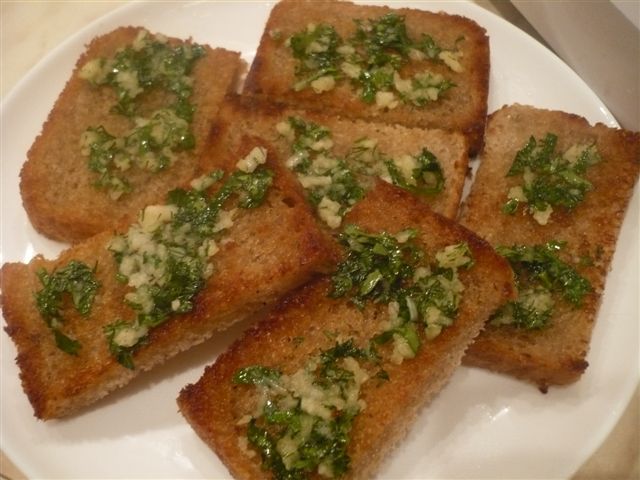 Гость, хлебушек режем прямоугольниками. На раскаленную сковороду маслом выкладываем хлеб. Выдавливаем чеснок, перемешиваем с зеленью и оливковым маслом. Переворачиваем гренки на вторую сторону, добавляем получившуюся смесь и перемешиваем
