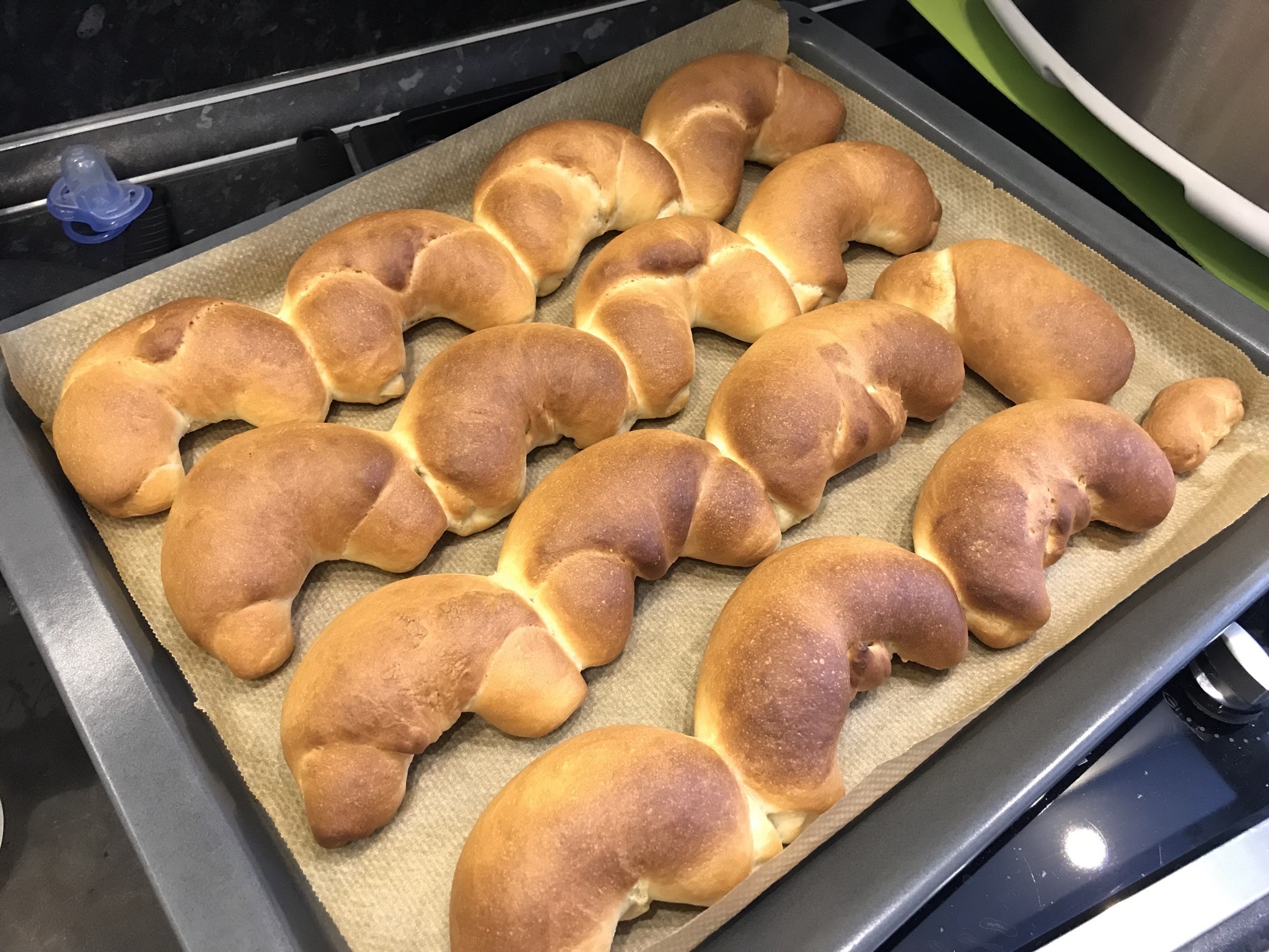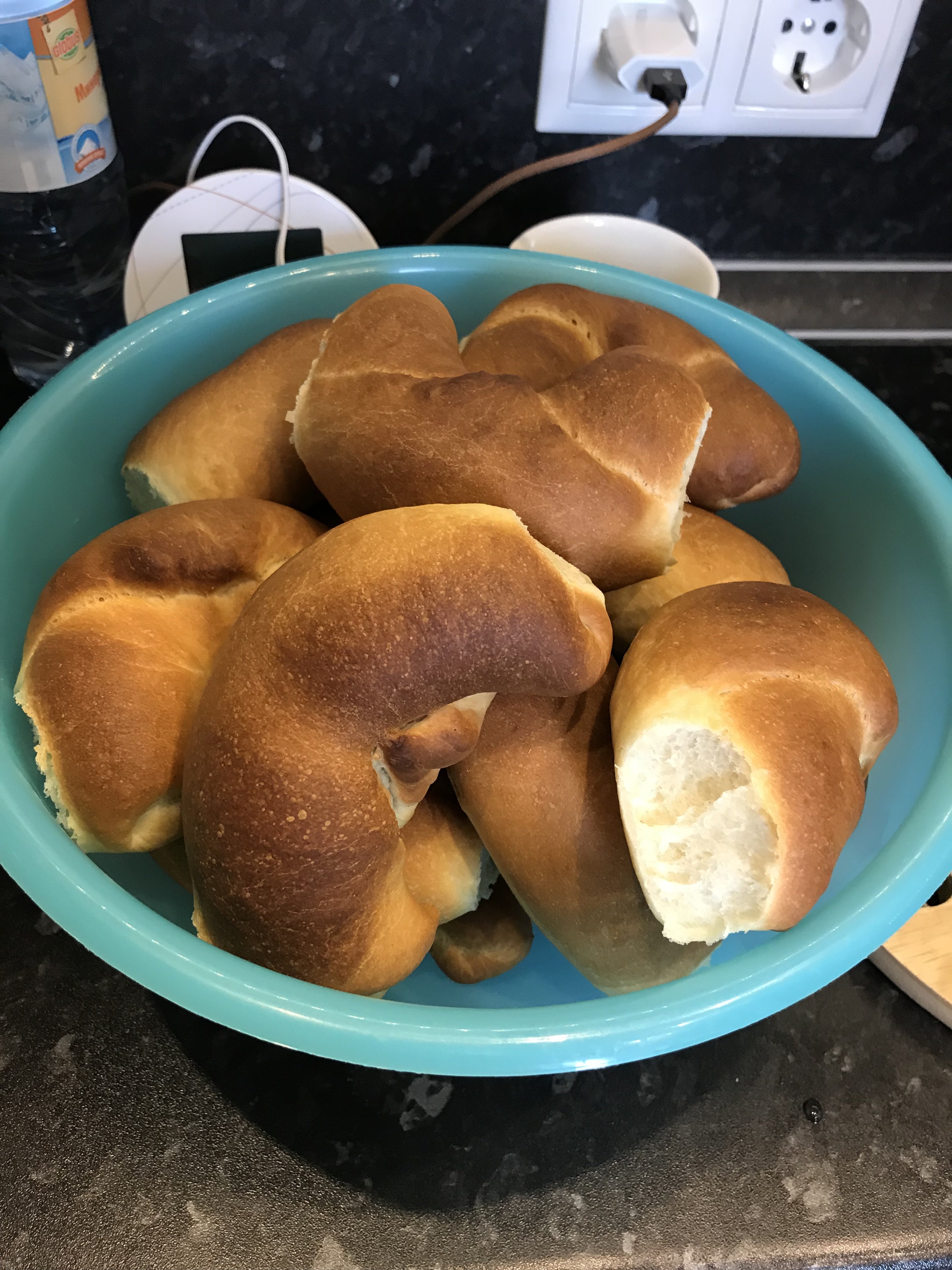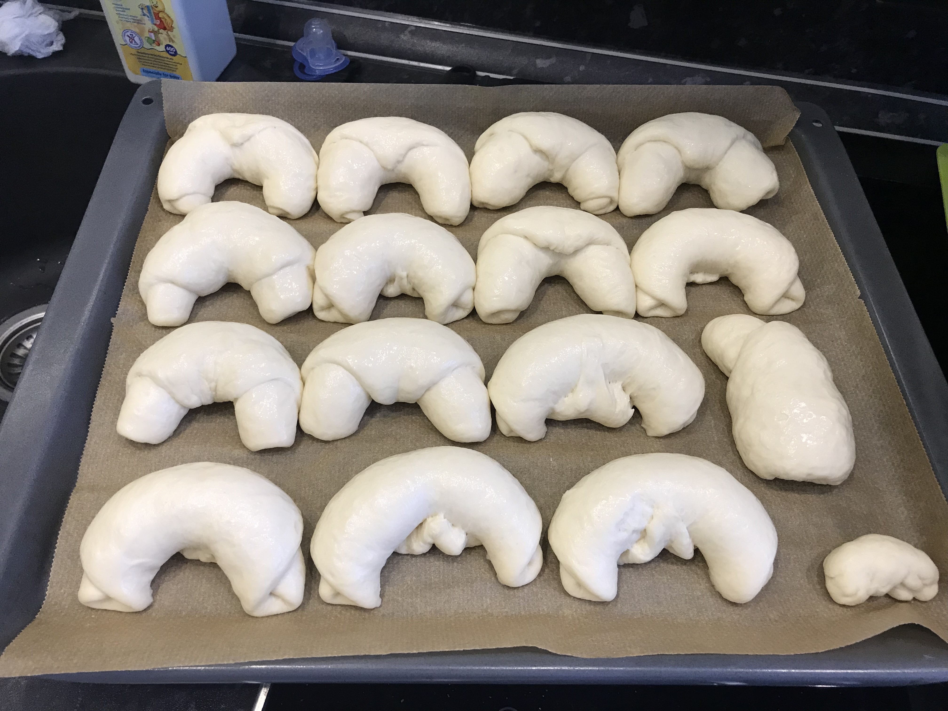 Рогалики 550гр муки 1ч ложка сухих дрожжей 35гр сахара 8гр соли 50гр сливочного масла (мягкое) 290гр воды В воде растворить сахар, добавить дрожжи, дать разойтись. Добавить муку (просеиваю), замесить тесто, в конце замеса добавить сливочное масло и соль, замесить. Оставить тесто на 1,5-2 часа. Разделить тесто на шарики по 60гр, подкатать их и дать расстояться 10 минут. Шарики размять в овалы липестки, свернуть в рулетик чтоб получилось 4-5 завитков, свернуть подковкой. Накрыть плёнкой, расстойка 50 минут. Сбрызнуть водой, выпекать при 220С 15-20 минут. У меня режим «Выпечка хлеба». Ну и рогалики должны быть порогалистей)), я первый раз лепила крутила)