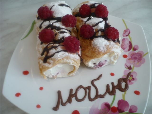 начнем, пожалуй "Трубочки из слоеного теста с ягодно-сливочной начинкой" 1. Раскатываем слоеное тесто очень тонко, режем его прямоугольниками или квадратами так, чтобы можно было обернуть вокруг скалки. У меня это не скалка, а палка толстая и плотная от фольги. Я ее мукой обсыпаю перед тем, как тесто на нее накручивать. Я накручиваю не спиральками, как в классическом варианте, а одним прямоугольником оборачивая и закрепляю. на 10 минут в духовку и полуфабрикат для трубочек готов 2. Взбиваем сливки 35% жирности с сахарной пудрой,аккуратно, чтобы ягодки оставались целыми, добавляем к сливкам большое кол-во ягод по вкусу и по наличию. У меня это была малина, голубика и клубника. Мужу больше всего нравятся с малиной. 3. Фаршируем трубочки и украшаем по своем вкусу. Лучшн оставить на ночь, чтобы пропитались, как следует! Очень вкусные и нежные получаются пироженые. Приятного аппетита.