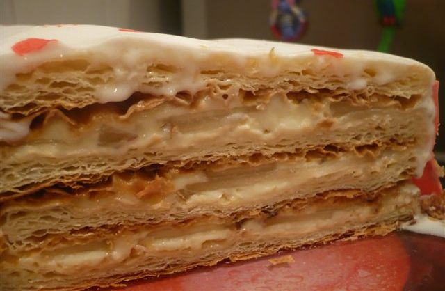ТОРТ " ФАНТАЗИЯ" Что нам нужно: упаковка слоеного готового теста груши 1-2 штуки и заварной крем я готовлю всегда по этому рецепту: 600 мл молока 2 желтка 1 стакан сахара 2 ст.ложки муки ванилин 100 гр масла Так как хотелось тортика легкого, масло в крем не добавляла, он итак вкусный получился. Итак, сначала я сделала крем: Желтки растереть с сахаром, добавить муку, разбавить частью молока до густоты сметаны. Оставшееся молоко нагреть в кастрюльке добавить ванилин и вливать струйкой яичную смесь, непрерывно помешивая. Варить помешивая до загустения, добавить масло( я не добавляла в этот раз), хорошо перемешать до гладкости и остудить. Крем должен быть абсолютно остывшим, даже холодным, я его в холодильнике держала. Печем коржи из слоеного теста, даем им остыть полностью. Выкладываем половину крема, слой груш ( я их порезала тонкими ломтиками) и сверху снова крем. У меня вышло 4 слоя. Из обрезков можно сделать крошку и присыпать поверхность торта и боковинки.