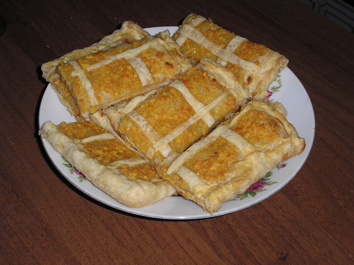 "Апельсин" 2 апельсина вместе с кожурой перекручиваем на мясорубке. Перемешиваем с сахаром. Получается начинка. Смазываем ей два пласта слоеного теста. Из обрезков теста сверху пирога делаем сеточку. И в духовку...