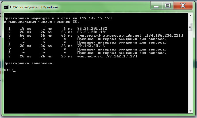 Трассировка маршрута к w.qiwi.ru [79.142.19.17] с максимальным числом прыжков 30: 1 6 ms 18 ms 1 ms ERTelecom-vgd-gw.transtelecom.net [217.150.63.93 ] 2 27 ms 27 ms 27 ms vgd01.vgd27.transtelecom.net [217.150.63.94] 3 53 ms 53 ms 54 ms 87.226.163.101 4 51 ms 50 ms 176 ms so-6-0-0.m7-igw3.msk.ip.rostelecom.ru [87.226.13 3.78] 5 27 ms 27 ms 27 ms 188.254.48.206 6 * * * Превышен интервал ожидания для запроса. 7 27 ms 27 ms 27 ms 79.142.30.174 8 * * * Превышен интервал ожидания для запроса. 9 * * * Превышен интервал ожидания для запроса. 10 27 ms 27 ms 27 ms www.mobw.ru [79.142.19.17 чет ходют они поразным маршрутам)) ]