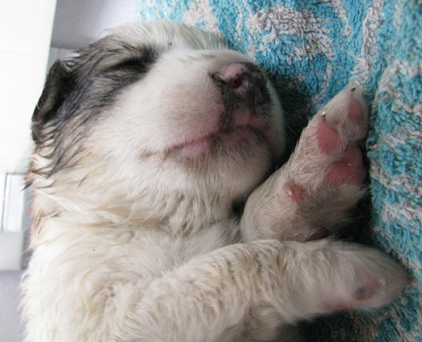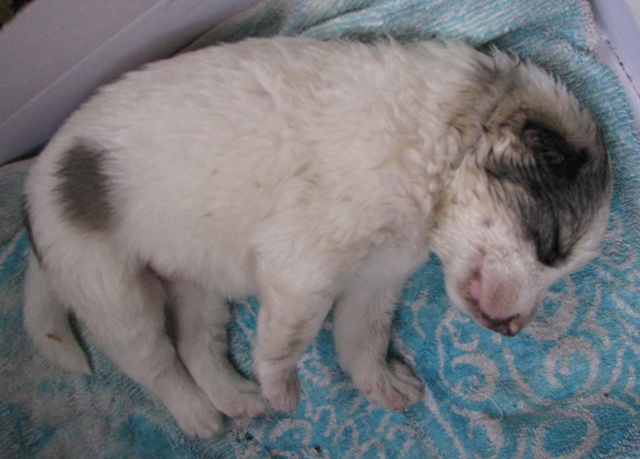Шли с работы, мимо оврага...Нашли ребёночка. 1. Что за неведома зверушка? Больше ладони, глаза чуть открыл. Недели две малышу. Кобелёк. Может кавказец ? 2. Спасли, принесли, напоили, спит. Что дальше-то делать? Он кроме молока что-нибудь ест уже? Лакать умеет. 3. И главный вопрос: КОМУ НУЖНА ХОРОШАЯ, БОЛЬШАЯ СОБАЧИЩА?