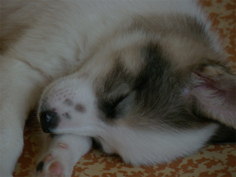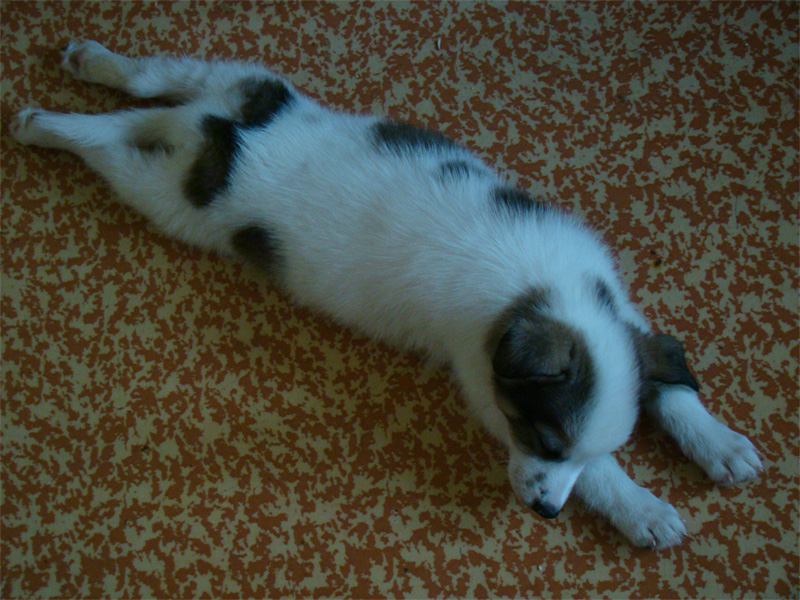 Ребенок весит 2,400 слез с молока и перешел на разнообразную пищу. Сообразительный до одури. Знает команды фу, ко мне, гулять. Единственное что убивает, так это что он ходит по маленькому каждые 15, двадцать минут. Сходим с ним на улицу, вроде все дела сделал, домой заходим шлейку снимаю, пока разуваюсь, оборачиваюсь в прихожей 3 лужи по всему периметру. Но не страшно, хорошо что в одно и тоже место ходит. Такой вот сыкун Уже нас узнает, хвостом виляет, пытается прыгать, но на бок валится. Пошел второй месяц.