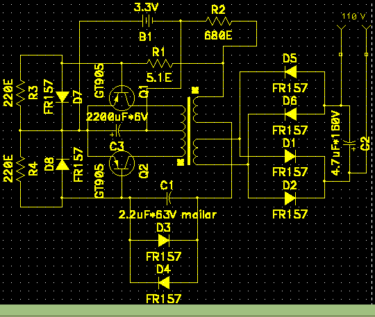 Johnny, Пардон, что ответил не сразу. Я же тебе схемку-то выслал!!! А то, что ты здесь привёл, мягко говоря, работать не будет!!!!!!! Ну максимум из 3х вольт с помощью такой схемы ты получишь 10...12, при токе 200...300 ma. Под те требования, которые ты поставил, подходит только двухтактный прямоходовый преобразователь, а не однотактный обратноходовый. Кроме того, 817 транзистор вряд ли 110 вольт допустит на своём коллекторе. Да и ток в коллекторе у него будет ампер шесть-семь в импульсе (если не больше). Потерь переключения, опять же, будет много... Так что бери мою схему и делай, кроме того, она 50 герц. меандр выдаёт, такой же, как в UPSах от компа... Хочешь попроще: в "Радио" за 87-88 год, в каком точно номере не помню, была схема преобразователя, правда, с 12 вольт, но зато простая. Можешь её взять, пересчитать на три вольта и сделать.