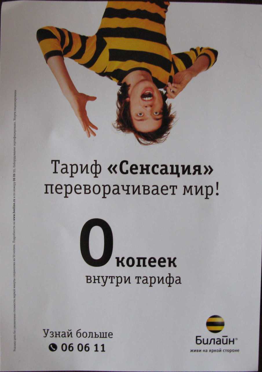 политика наеписания мелким шрифтом мне понятна... я же говорю "карубисель" И так во всём бизнесе в России, наверное. Это не бизнес это "развод", но грамотный. Куда ни кинь везде мерчендайзеры и промоутеры. Грустно... "29 октября 2008 Не так давно «Билайн» выпустил новый тарифный план «Сенсация». Для большинства абонентов условия данного тарифного плана явились действительно сенсационными: исходящие звонки внутри тарифа –ноль рублей! Смс абоненту тарифа «Сенсация» всего 25 копеек! Заметная экономия на связь как в Волгограде, так и при пользовании сим-картой «Билайн» «Сенсация» в городах ЮФО. Разве можно утаить такую сенсацию?! Об этом нужно говорить громко!!! На остановках общественного транспорта, в самых многолюдных местах Волгограда промоутеры АМК «BTLine», используя рупоры, вещали сенсационные новости «Билайн», раздавали информационные газеты, рассказывали о преимуществах нового тарифного плана «Сенсация». Поставьте и Вы свой сенсационный рекорд, общаясь и отправляя смс по сенсационно выгодной цене! Протестируйте новый тарифный план «Сенсация»! Сделайте свое общение простым и выгодным!" Противно...