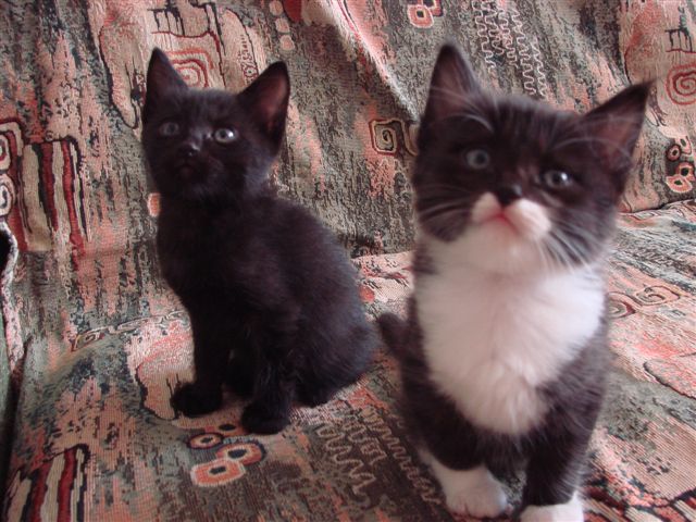 Два котика (6 недель) полностью черный и черно-белый с носочками и белой грдкой ищут хозяев (добрый, ласковых, заботливых). Едят все, к туалету приучены. Бодрые и здоровенькие. Их мама русская голубая, а вот папа .... здоровый и активный пробегающий мимо дачи кот.:frustrate