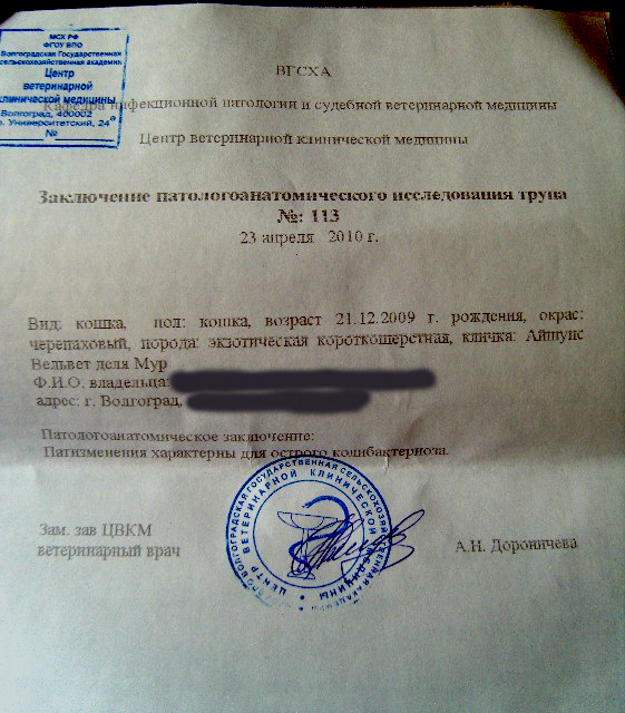вот,в моем понимании, нормальное подробное описание вскрытия,которое позволяет оценить достоверность заключения,например: кот привозной, погиб предположительно от онкологии через 3 месяца после приезда в новый дом.