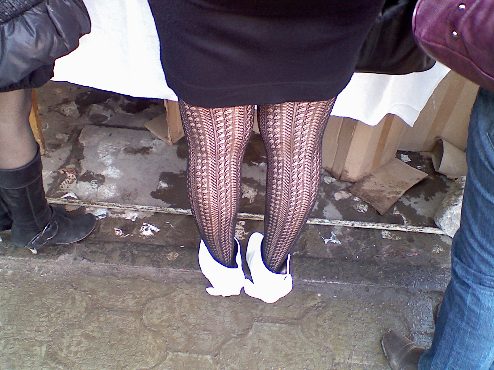 Чрезвычайно редко видел теток у которых на ногах хорошо смотряться колготки сеточкой. И то о бычно это были короткие чулки, выше которых видна девичья ножжка. Короче колготки все портят нах. Да и качество фотки деиствительно подводит. На сапожках бантики - начерта? Большие слишком - где наити одежку чтобы к ним подходила, и смотрелась? Черт подери, мне нравяться темные полусапожки и не броские колготки. А то как напялят порои полупрозрачные белые, с красными самогами, аж тошнит. Вроде смотрищь - девченка классная, привллекательная - но белые колготы все портят. добавлено через 7 минут Фотка с юбкой - намного лучше, но тоже не то, выигрывает за счет задницы, очень красивая наверное задница и приятная. но колготы все портят, а сапогов вообще толком не видно, и бантиков. Я подумал - вообщето бантики могут быть очень даже ничего. Но без колготов.