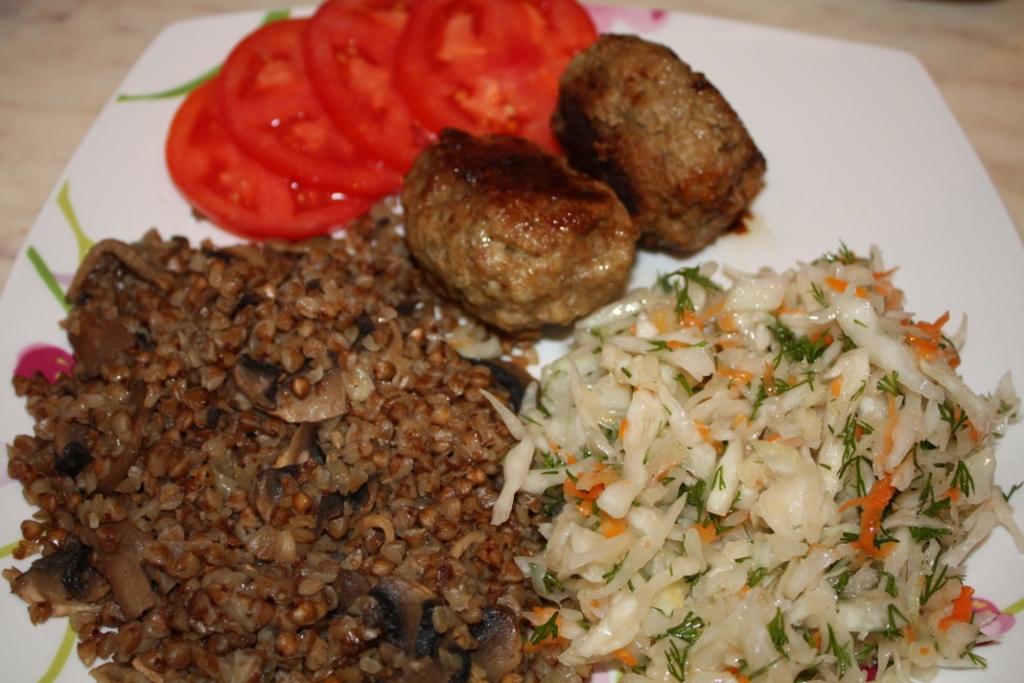 Биточки мясные.Фарш домашний (50% свинина, 50% говядина) – 400 гр. Луковица – 1 крупная Картофель – 1 шт. Яйцо – 1 шт. Хлебный мякиш, пропитанный молоком Соль Перец В блендер складываем луковицу, яйцо, очищенный картофель и хлебный мякиш. Взбиваем до однородного состояния. В фарш выливаем полученную смесь, солим, перчим. По желанию можно добавить зелень. Формируем биточки, выкладываем в кастрюлю от мультиварки. Ставим на режим выпечки на 60 минут. Через 30 минут переворачиваем, чтобы биточки обжарились с обеих сторон. Далее включаем режим тушения на 1,5 часа. Получаются восхитительные, нежнейшие биточки! Гречка по-селянски. Рецепт из книжки к мульте. Гречка просто сказочная получается! Гречка – 1 чашка (150мл) Бульон куриный – 1,75 чашки Луковица – 1 крупная Грибы (я делала с шампиньонами) – 250 гр. Соль Масло сливочное – 30 г. Я включила мультю на режим выпечка, положила масло. Когда оно растопилось – положила лук и грибы, обжарила минут 15-20. Выключила. Положила гречку, залила бульоном, посолила. Поставила на режим гречка. Просто супер!!!!!