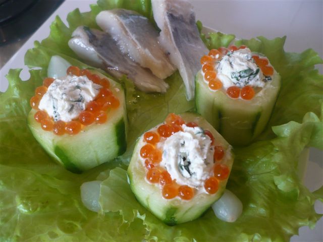 Очень легкая и свежая закусочка. Огурцы фаршированные огурец (потолще и подлиннее ), 1 яйцо ложка сметаны соль перец для украшения - что угодно Яйцо натерла на крупной терке, добавила сметанки, соль, перчик и вымесила. Огурчик очистила от шкурки, нарезала бревнышками и удалила внутреннюю часть, оставив тонкое дно. Нафаршировала яичной смесью и украсила. Я украсила крем-чизом с зеленью и красной икрой. Можно украсить крупной креветкой каждый столбик или веточкой зелени и много еще чем. Приятного аппетита