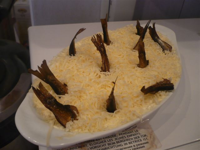 салат "Рыбки в пруду" вареный картофель - 1 крупная картофилина вареные яйца - 2 шт банка шпрот сыра немного майонез чеснок 1 слой: картофель тертый на крупной терке майонез 2: шпроты, вилочкой помятые (хвостики отломить и отложить) майонез 3: яйца, натертые на крупной терке майонез с чесноком 4: сыр на мелкой терке и воткнуть сверху хвостики от шпрот. Мы ели через 2 часа после приготовления, было вкусно. Но постояв ночь в холодильнике он стал намного сочнее и вкуснее!