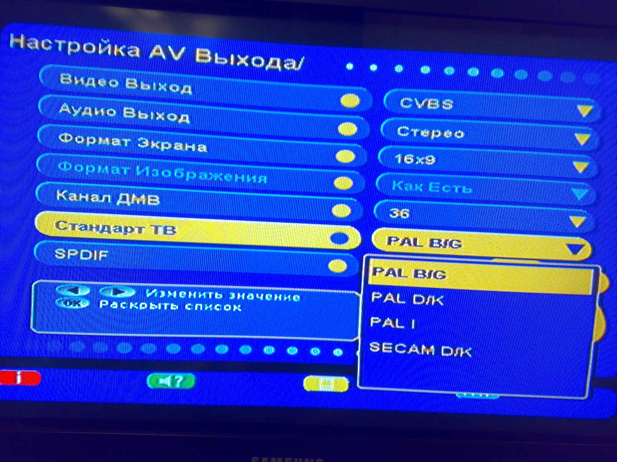 скарт 120р - написано "полный скарт" телевизор самсунг slimFit 16:9 сзади 2 скарта у телика - один (RGB) второй (AV) Щас подключен к (AV) В приставке вагон настроек - их не трогал.