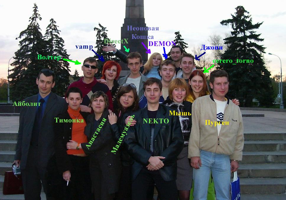 нашла фото встреч форума с января и февраля 2006 года (Техас и Арка?), Гучи, Амина, Тимонка, Вамп, Бильд, Отелло, Иван, Испанец, и мальчик какой-то с девушкой)) были еще со "свадьбы" Некто и Катти Сарк, и встреча на Алле Героек.. поищу))