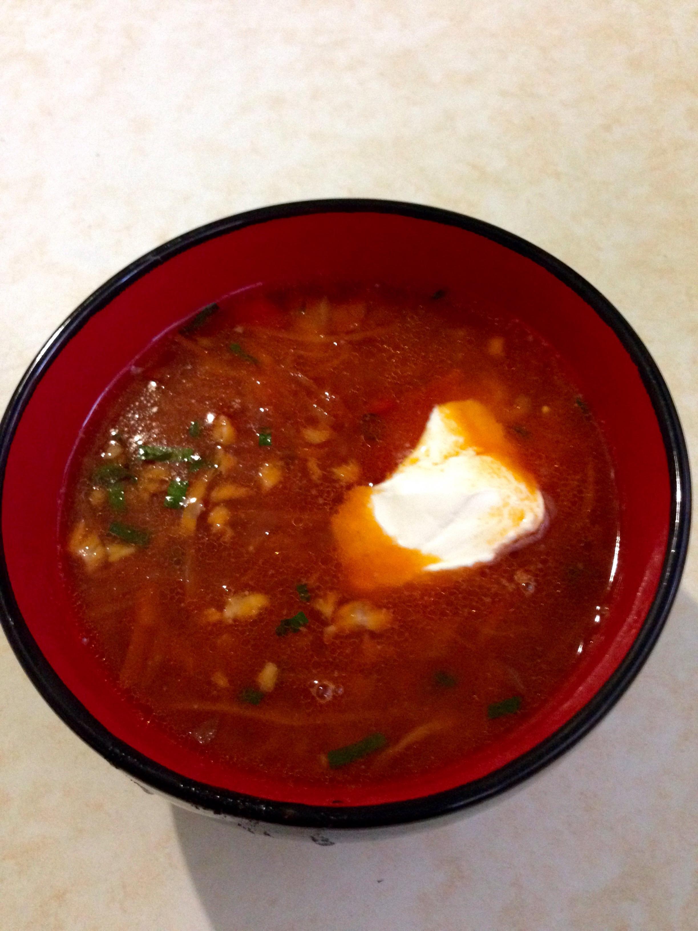 Сегодня борщ ну очень быстро и подойдёт для веганов тоже)) Вчера в Глобусе купила нашинкованные овощи, что сегодня мне съэкономило кучу времени. И так, бульон: вода, морковь целая, луковица, перец горошком, лавровый лист, стебли укропа/петрушки - всё закипело, покипело, сварилось. Пока варился бульон, готовилась пережарка в большом сотейнике: оливковое масло, сразу вместе репчатый лук+морковь+перец болгарский красный, обжарила, добавила свеклу, томатную пасту (магазинную), зелень, чеснок - накрыла крышкой, тушилось. В бульон картофель, предварительно вымачиваю в воде минимум 30 минут. Через некоторое время капусту в бульон. Чуть позже фасоль красную консервированную и пережарку, всё закипело, пару минут и выключила. В тарелку сметаны, чёрный хлеб с пузаниной и горчицей))) Сметана есть, остального нет) Борщ, щи, солянку и харчо, предпочитаю варить в 5ти литровой кастрюле. Остальные супы делаю на 3л. На плите тоже без мяса получается очень даже.