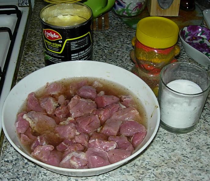 Свинина с ананасами Продукты: - свинина - банка консервированных ананасов - специи - соль - сыр - картофель - майонез Сначала маринуем свинину: Режем кубиками, складываем в емкость, специи, соль - по вкусу и заливаем ананасовм соком и оставляем на 1,5 часа (можно на ночь). Затем чистим картофель и режем соломкой, выкладываем на дно. Сверху маринованную свинину. На нее кусочки ананаса. Далее трем сыр и посыпаем им. Потом снова беремся за картофель, но теперь нарезаем его кружочками и выкладываем плотно, как бы делая "крышечку", заливаем майонезом, разливаем оставшийся маринад и отправляем в духовку примерно на час. Приятного аппетита