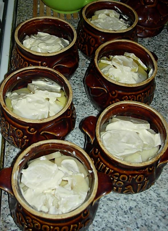 Вобщем тут написанный рецепт с курицей и рисом -решила испобовать со свининой. На дно горшочка - промытый рис, затем свинина мелко порезанная посоленая поперченая залитая майонезом и оставленная на 5 минут, затем лук кольцами тонюсенько порезанный. Залила - сметана+сливки+майонез. И посыпала сыром. Закрыла крышечкой. Хорошо разогрела духовку (обыкновеная), на среднем огне, через 10 минут убавила огонь - и так томилось 45 минут...вкуснотень не передаваемая...