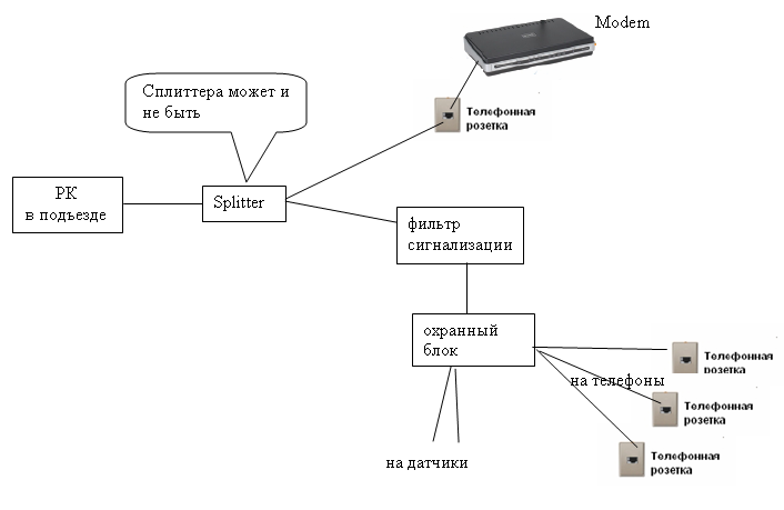 lexic, опиши подробно разводку по-квартире, желательно нарисовать в паинте, например Меня интересует: - сколько телефонов - где стоит сплиттер - откуда и как идет провод до модема и до каждого телефона. Думается, либо сплиттер не там где надо стоит, и какой-то телефон сажает линию, либо шаманство Болжно быть примерно следующее: