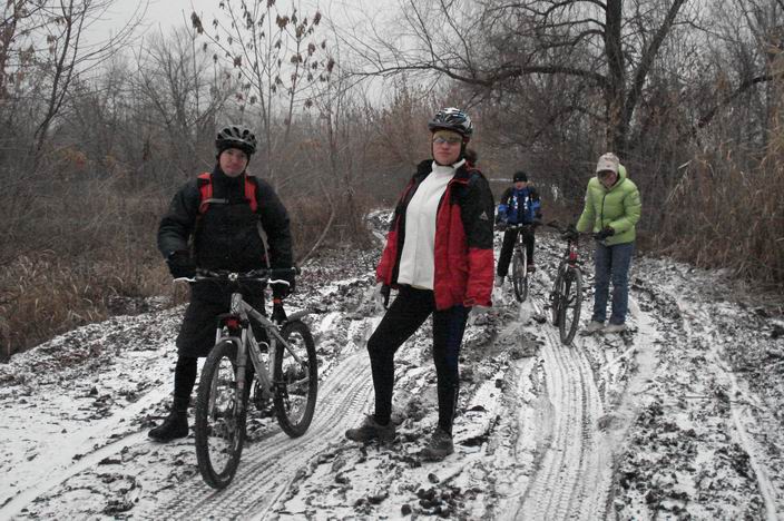А теперь по-порядку: Утром я долго стояла, как осел между двумя охапками сена. Что надеть - вечный вопрос. Каждый раз, собираясь на покатушку, я ломаю голову, как бы так одеться, чтоб и в движении было не жарко и на остановках не холодно. Положение усугубляется тем, что нынче особо не попереодеваешься - холодно, однако. Надела примерно то же, что и всегда Обнова была одна: новые ботинки. Было ясно, что без шапки дубак. Шлем на мою лохматую шапку налезал, но с условием, что либо я не буду его застегивать, либо не буду дышать. За такое бесчеловечное ко мне отношение он был наказан: оставлен без прогулки. А еще выяснилось, что тормозные колодки на заднем колесе того. Совсем-совсем. Торчащая из них железяка недвусмысленно угрожала ободу колеса. Спереди железяк не просматривалось, но по толщине от задних колодок передние отличались мало. Ага, вот теперь точно протерлись! А то забавно так пишут на сайтах и в инструкциях: "проверьте состояние тормозных колодок". Ну проверила, допустим, и что? Напоминает указание в правилах для автомобилистов: что-то вроде "при подъезде к трамвайным путям убедитесь в отсутствии трамвая". Короче, привет, Фри-Райд, скоро мы идем к вам. Примерно в 8.45 пароходик доставил четверых велотуристов на тот берег Волги. В "Магните" к нам присоединилась жена Tolibanych!`а. И ровно в 9.00 мы отправились на встречу с руководителем покатушки PSV, который в компании еще троих "спиртсменов" (его собственное выражение) выехал на ночевку в пойме еще вчера. А зима!! Ура, товарищи, мы дождались его! Первого снега!!! В городе, наверняка, его быстро растоптали. А мы катили по свежему-свежему снежку Падающие снежинки сразу мне напомнили, что я забыла очки. Так бывает, если долго не кататься. Целых 2 недели. Лужи были покрыты свежезамерзшим льдом, а сверху и снежком. Лужи побольше выдавала неестественная гладкость. А в лужи поменьше мы иногда с размаху въезжали, с треском проламывая лед. Но пронесло, в лужу никто так и не вляпался. Лишь однажды свернули не туда, но в общем без приключений встретились с PSV и sasha pronin`ым, которые провезли нас погреться к месту дислокации их ночной базы.