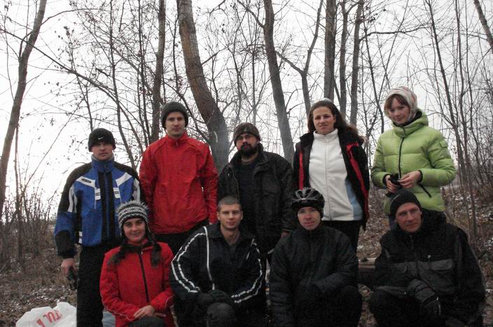 Между двумя могучими бревнами горел костер, у которого грелись "ничуть не замерзшие" rootproc и Кирилл. Кирилл похвастался живописным трофейным пятном грязи на штанах и багажнике (фото 1): похоже, вчера грязь еще не подморозило. Мы с Вероникой использовали возможность погреть ноги (фото 2). Мои крутые носки, надетые всего в 3-ий раз с момента покупки, я-таки немного подпалила. Главное, ботинки остались целы. И даже я ухитрилась их за весь день не угваздать в грязи! А не зря купила, у некоторых ноги мерзли поболе моего, что редкость. Нам было хлебосольно предложено подкрепиться. И было чем, у них там, оказывается, вообще Европа была: говорят, мангал был и шампуры, и они шашлыки из курицы жарили! Но мы еще есть совсем не хотели. Сделали общее фото (фото 3, верхний ряд слева: Dirty Innocence, rootproc, PSV, Вероника, Нина (жена Tolibanych!`а ); нижний слева: Maja, Кирилл, Андрей, sasha pronin). Вскоре народ собрал барахло, мы немного проехали вместе, попрощались со всеми ночевщиками, кроме PSV, и поехали кататься.