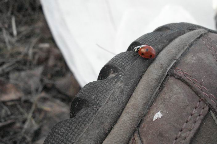 К часу остановились на обед. Нина отошла в сторонку (фото 1). Жив ли ты, Tolibanych!? Подай голос! Сходили за водой к ерику: холодная вода, неприветливая (фото 2 и 3). Разогрели на костре и попробовали хваленый шашлык из курицы: вкусно! Сделали чай. Божьи коровки ползали повсюду. Одна ползла по моему ботинку. Пока я доставала фотик, она умотала на подошву (фото 4). Пришлось изворачиваться. Народ досадовал, что нету другого фотика, чтобы сфотографировать мои попытки сфотографировать божью коровку. Вместо заявленного часа проотдыхали мы 1 час 45 минут.