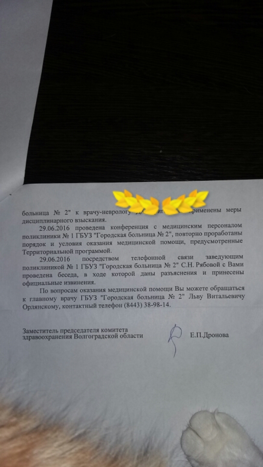 Ну вот, сегодня позвонила заведующая поликлиники. Приятная женщина, интересовалась моим здоровьем, нужно ли мне дальнейшее наблюдение у невролога их поликлиники,извинилась за поведение своих сотрудников. Сообщила, что в ситуации разобрались, её вообще не должно было быть, с врачом провели беседу. В дальнейшем, когда мне потребуется врач-невролог, сказала обращаться к ней, что бы в дальнейшем я к этому неврологу не попадала. Очень жаль, что её не было на месте в тот день, тогда не было бы и жалобы.