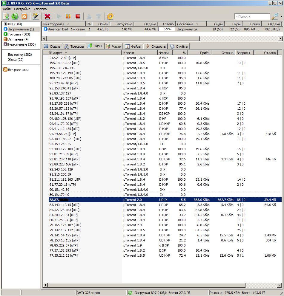 LORIC, А почему почти на всех торрентах они не присасываются? Кол-во соединений менял, порт открыт, слотов раздачи 50 штук, пиров за раз до 100. Вот откуда щас качаю: http://torrents.ru/forum/viewtopic.php?t=2325634 С раздачей и пирами по статистике там - бодрячком, а я не могу оттуда ничего получить. Щас эксперемент поставили с Волгоградцем уцепившимся на этот торрент, он тут же пошёл с меня качать и очень быстро. А я немогу ничего толком скачать уже более часа.