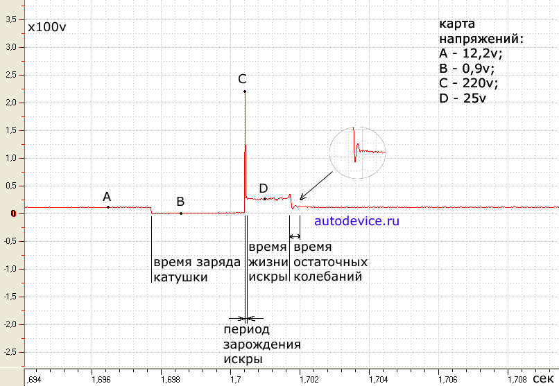 для батарейной системы зажигания 3-5Ом, для бесконтактной 0.4-0.8Ом. вот осцилограмма с картой напряжения это Ваше воображение, повторюсь, сам вложил 4000 долларов озвученые Вами, еще десять лет назад, четко понимая , что контрольки не достаточно. Спросите куда знания делись?если и были в убеждение что не верблюд, общество такое - мало кем то быть, еще и преподнести себя надо. с одной конторлькой рублей 300 норма-час, со сканером и осцилографом 1200-1500( в серднем)