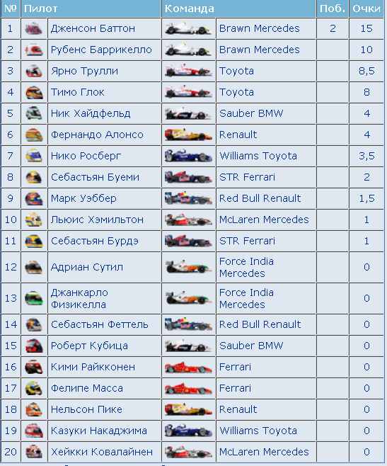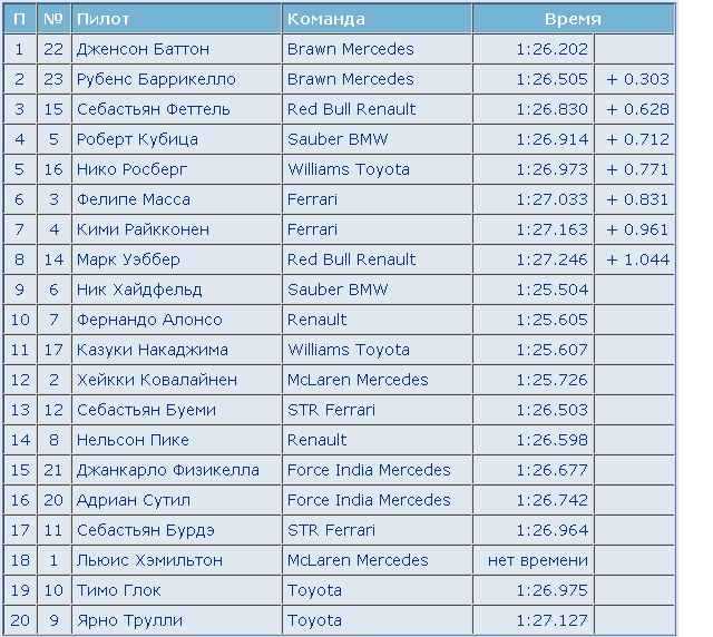 Попов доходчиво сегодня всё рассказал по поводу Хэма. что могу сказать, уважения к нему у меня стало ещё меньше. поэтому сегодняшней квалификации я несказанно рад, несмотря на то, что сенсационно Масса пролетел ещё в первой сессии добавлено через 1 минуту Куала-Лампур (Малайзия) 60-й чемпионат мира по автогонкам в классе машин "Формула-1" 2-й этап "Гран-при Малайзии" Квалификация 1. Баттон (Великобритания, "Браун") - 1:35.181 2. Трулли (Италия, "Тойота") - - 1:35.273 3. Глок (Германия, "Тойота") - 1:35.690 4. Росберг (Германия, "Уильямс") - 1:35.750 5. Уэббер (Австралия, "Ред Булл") - 1:35.797 6. Кубица (Польша, "БМВ-Заубер") - 1:36.106 7. Райкконен (Финляндия, "Феррари") - 1:36.170 8. Алонсо (Испания, "Рено") - 1:37.659 9. Баррикелло (Бразилия, "Браун") - 1:35.651 10. Хайдфельд (Германия, "БМВ-Заубер") - 1:34.769 11. Накаджима (Япония, "Уильямс) - 1:34.788 12. Хэмилтон (Великобритания, "Макларен") - 1:34.905 13. Феттель (Германия, "Ред Булл") - 1:35.518 14. Ковалайнен (Финляндия, "Макларен) - 1:34.924 15. Бурде (Франция, "Торо Россо") - 1:35.431 16. Масса (Бразилия, "Феррари) - 1:35.642 17. Пике (Бразилия, "Рено") - 1:35.708 18. Физикелла (Италия, "Форс Индия") - 1:35.908 19. Сьютиль (Германия, "Форс Индия") - 1:35.951 20. Буэми (Швейцария, "Торо Россо") - 1:36.107 Пилот "Брауна" Дженсон Баттон остается непобедимым в этом сезоне. Вслед за дублем в Австралии, британец выиграл и квалификацию "Гран-при Малайзии". Себастьян Феттель и Рубенс Баррикелло заняли по итогам сегодняшних заездов соответственно третье и четвертое место, однако из-за различных штрафов потеряли свои позиции: немец будет стартовать завтра с 13-й позиции, а бразилец - с девятой. http://news.sport-express.ru/online/ntext/29/nl294150.html