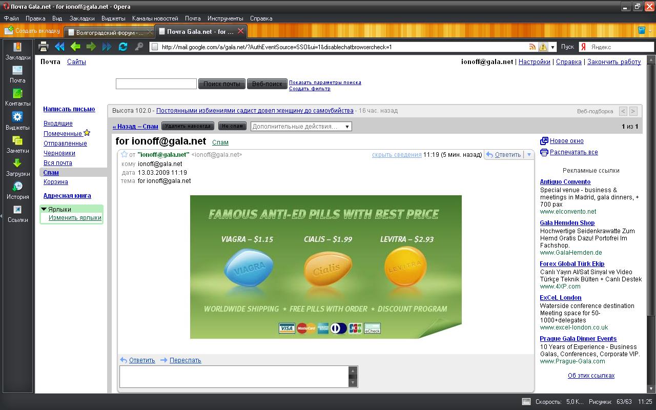 постоянно в спам приходят письма, содержащие призывы увеличить хозяйство, скачать терабайты клубники, предложения подъемных таблеток по смешным ценам. У меня украинская почта gala.net, которая с 2007го года перешла на движок от гугл, чем и подкупает - работает быстро, удобный интерфейс и всё такое. Раньше замечал, что в авторах писем иногда написано "я". ну, думаю, мошт, чувака так зовут. А вот сегодня заинтересовался и открыл одно такое письмо. В поле автора письма значилось "ionoff@gala.net", в поле получателя - "ionoff@gala.net" (см. скриншот). Поэтому движок и писал в авторах письма "я" - выходит, письмо, по его мнению, писал я себе сам. Так вопрос. Как такое может быть, и значит ли это, что все письма, приходящие на мой адрес, дублируются на почту того коня, что отсылает эту херь?