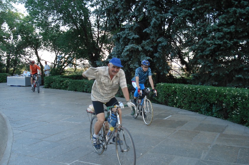 Встретились у вышеозначенной скульптуры. Проводили марафонцев в дальний путь. Символом серьезности четырехсотки перед предыдущими марафонами стали велоштаны с памперсами, почти у всех Мягко сидючи, наслаждаясь весьма летной погодой, народ укатил довольный