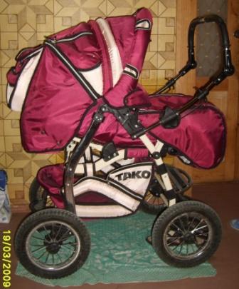 КОЛЯСКА (ф. Тако,зима-лето, трансф., надувн. колеса, дождевик, москит. сетка, хозкорзина, сумка для мамы, люлька-переноска, перекидн. изгиб. ручка, цв. бордово-бежевый., отл. сост.), 5 тыс. тел. 8-902-651-22-98