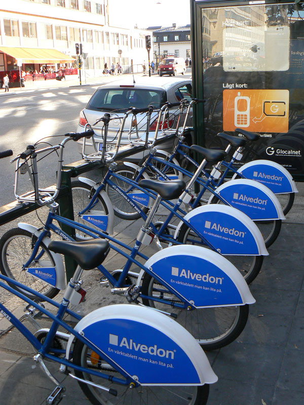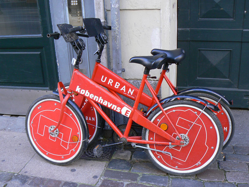 Во многих городах в мире организован прокат великов. Цена примерно 2-3 евро в час. Первые полчаса бесплатно. Вот сфоткал прокатные велы в Стокгольме и Копенгагене. Вряд ли такие захочешь угнать, да и сломать их довольно трудно....
