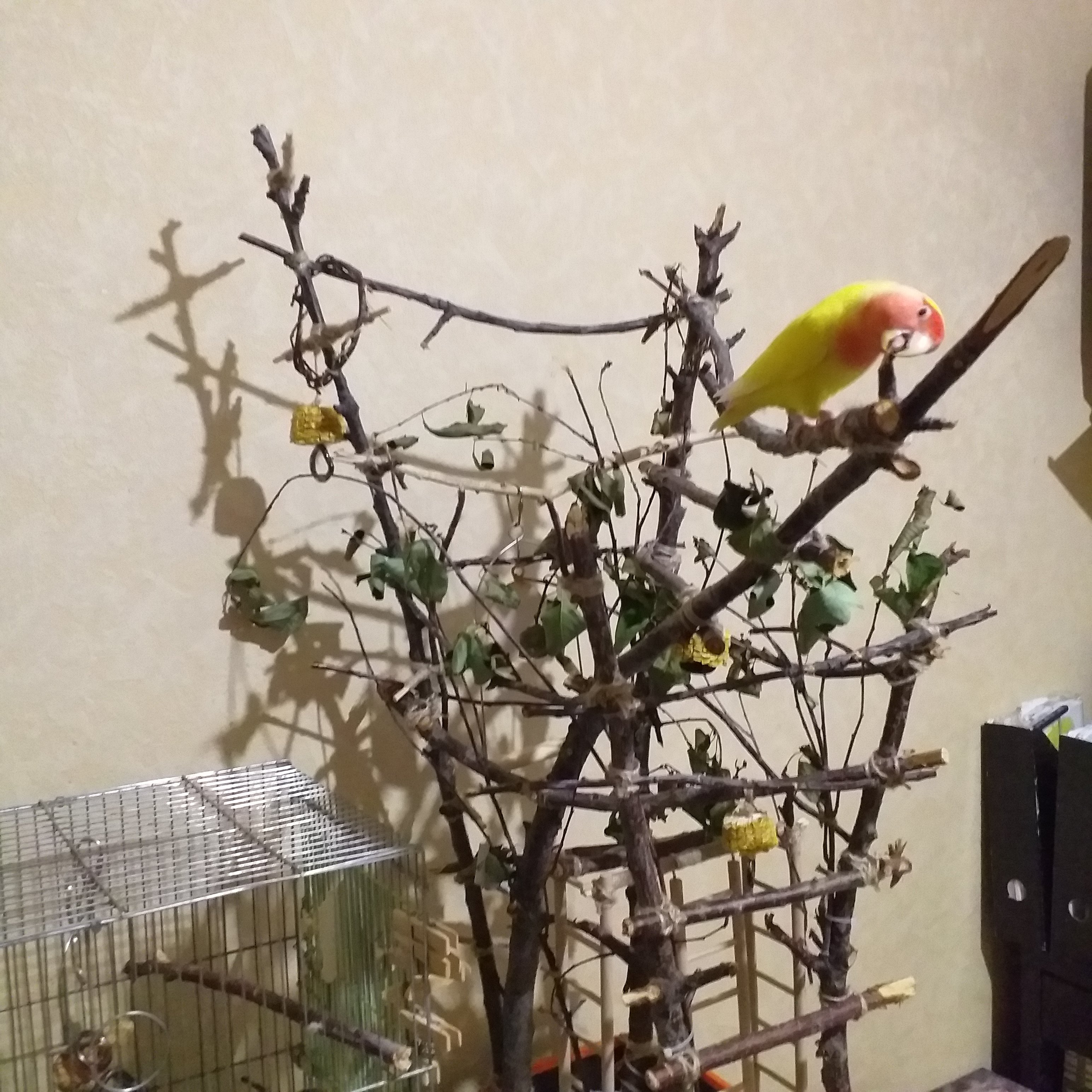 Это ж неразлучник, у них в принципе программа - разгрызть в труху все, что не приколочено, а что приколочено - отодрать и разгрызть в труху)) Поэтому все критичные места во время прогулок накрываю чем-нибудь. Сейчас прям облегчение, она почти все время тусуется на этих вот ветках.