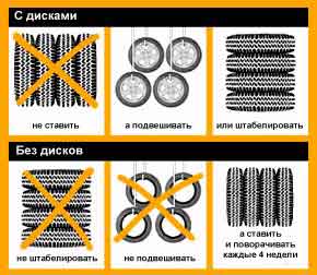 Резина не в сезон хранится в гараже двумя стопками по две на дисках. Проблем за 20+ лет не ощущал пока.