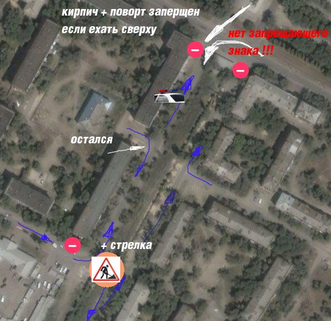 Возможно добявт запрещающие знаки вскоре но сейчас есть как есть, А может и не будут добавлять:d Плюс один знак разрешающий остался из-за двора поворот, поэтому машина стоит там где я нарисовал.