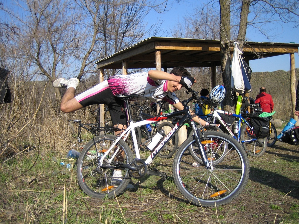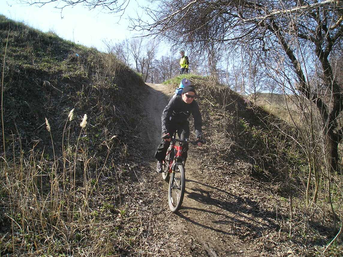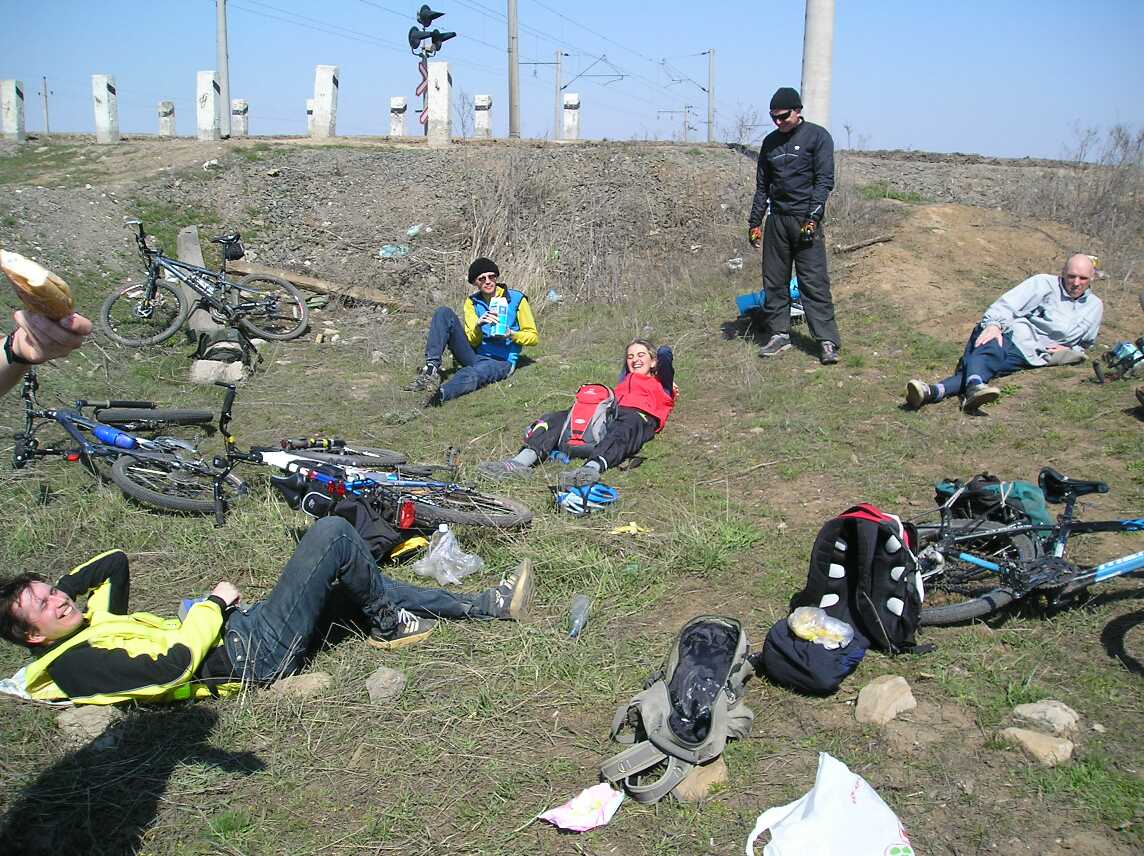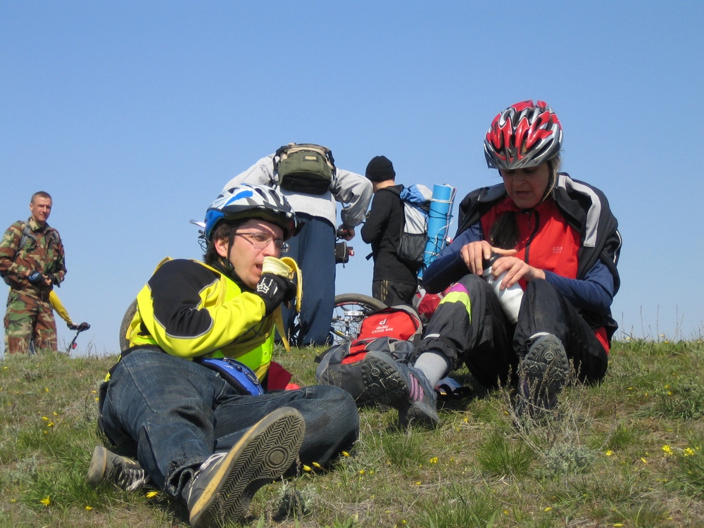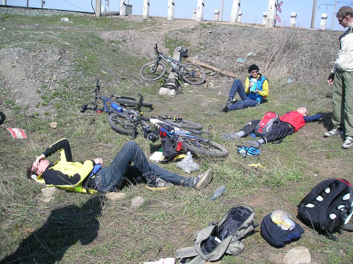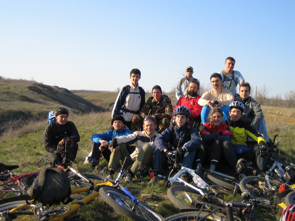 Активная покатушка на Ангарском 12.04.2009 Морально я готовился к «Волгограду насквозь-2 (пешком)» на эти выходные, но этот план не осуществился. Зато прочёл «Долгую прогулку» Стивена Кинга, произведшую на меня впечатление, наложившееся на хворое состояние, близкое к шоковому. После обеда, в субботу, планы, к счастью, резко изменились, в результате чего я смог участвовать в воскресной покатушке. Только вот почему сразу не отписался — не знаю. А может и знаю. Вечером Maja прислала сообщение с приглашением — это здорово! Я еду уже безоговорочно! Сходил в магазин — зефир, «чепеньки», конфеты, бананы. Вопрос, две или одну секцию рюкзака на багажник навешивать, особо не вставал, но решил поехать с одной секцией: валить на бок не должно, а будет — подстроюсь. Прогноз погоды был до +10 градусов днём, солнечно, тем не менее взял толстовку, а, подумав, потом и куртку, о чём не пожалел. В воскресенье с утра с «медитированием» «я успеваю, успеваю» совершаю последние приготовления. И с тихим возмущением «блин, опять проканителился!» («А-А-А, времени!!!») в 08:00 выскакиваю на улицу. Поспешая, не торопясь, мчусь к месту встречи. Настроение — замечательное, погода — великолепная, машин — мало. Рюкзак, хоть и объёмен, но не перевешивает — это плюс. Немного задеваю пяткой — это маленький минус. Вот и приехал, запас времени — 7-мь минут. На всякий случай проверяю со стороны улицы, но никого нет. Снова во двор. И жду. Чуть поостыл — вот и куртка пригодилась. Хожу, меряю двор шагами. У «Конфеток-бараночек» погрузка тортами. Их (тортов) так много, аж и не верится, что столько съедят Управитесь ли вы быстрее, если вас подгоняют, постоянно названивая на телефон? Вряд ли. Надо просто ждать. И всё будет хорошо. Maja появилась в дверях подъезда с небольшим дипломатическим опозданием и мы поехали на встречу с PSV и sasha-pronin-ым. «Час «Х» близок, нас уже ждут!» Помчали! На Ангарской PSV и sasha-pronin вырываются вперёд... и исчезают. Едем вдвоём к месту встречи. Подтянулись, познакомились, с кем не были знакомы. Обратил внимание, что имя в основном не запоминается. Проще по нику. Ник на форуме примелькается, запомнится, примерную манеру общения человека можно усвоить. И что PSV торопил? «Лордов» то нема! velotanc-а ещё в парке напротив конечной остановки 12-го маршрута троллейбуса встретили. Отзвонились им — едут. Значит, можно к месту назначенного старта, чуть назад за АЗС, переехать. А чтобы «Лорды» мимо не проскочили, будет кто-то на обочине стоять. Мне тоже интересно стало, заметят или нет? Вижу, едут, мимо едут! Спрыгиваю с пригорка на обочину, руками сигнализирую, Сергдж приветственно рукой помахал и дальше катит. Нет, думаю, надо ещё голосом помочь «Сергей, сюда!» Шорох покрышки об асфальт, группа оттормаживается и поднимается к нам. «Стартовая» фотография. И вперёд! А дальше дорога и эмоции. Ах, да, ещё подобие тропинки было, веточки деревьев в прорези шлема пытаются забраться, застрять в спицах. Подъёмы, спуски, повороты. Сколько раз мы останавливались на более-менее продолжительное время? По-моему, раза четыре. Бананы — практически идеальный продукт для подкрепления сил. А ещё мармелад, сок и вода. И с двух точно открывались сногсшибательные виды! Если абстрагироваться, что мы недалеко от города, то ощущение похода. Правда, я в походе ещё не был, но, думаю, похоже. Первый диалог: — Ну, как? — Супер! Второй диалог: 