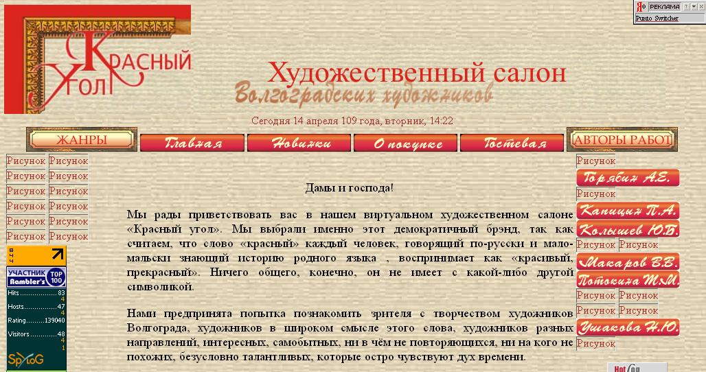 Разыскивая в сети творчество одного знакомого, случайно нашла сайт "Красный угол", где предпринята попытка собрать вместе волгоградских художников. Ну что тут можно сказать? Сильное УГ,бьет наповал. Дизайн не то чтобы скверный, а просто какой-то нелепый, впечатление такое, будто школьница восьмого класса делала на конкурс домашнюю страничку любимого хомячка и победила. На главной странице слева и справа огромные страшные кнопки, в середине статья, начинается со слов "Мы рады приветствовать вас в ..." и так далее. Кто эти "мы" - не сообщается. Подбор художников случайный. Тьма фактических ошибок. Перепутано все. Не намерена делать за этих конспираторов их работу, (а вышло так, что я более-менее знакома с предметом просто в силу специфики предыдущей трудовой деятельности), отмечу только одно для примера : биографические сведения о художнике Людмиле Ершовой целиком не соответствуют действительности! Попытка нажать большую устрашающего вида кнопку "скульптура" в левой колонке с жутким заголовком"жанры", где, к слову, чисто тупо и конкретно перепутаны жанры, и техники, а под кнопкой "авангард" прячутся любительские картинки девушек с розочками, окончилась плачевно: вылезла огромная текстовка "Извините, на данный момент работ в этом жанре нет". Извинения не принимаются, дорогие подколодные партизаны. Так таки и нету в Волгограде ни единого скульптора? Нет нужды подробно анализировать с позволения сказать "контент" и, не побоюсь этого слова, "юзабилити" этого творения, просто любопытно, кто эти герои и зачем они это сделали?