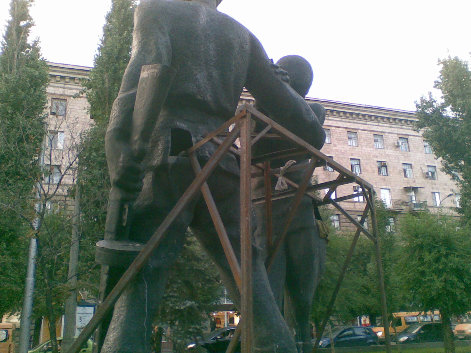 Ни фига подобного. Был лично на месте происшествия часа чере 3 после самого происшествия, то есть вечером 19 апреля. У фигуры одного из парней сильно помята голова. Для того чтобы её выправить, нужно залезть внутрь фигуры, и оттуда стучать наружу. Совершенно не представляю, как это делать. Разве что голову отрезать, выправлять, а потом назад приваривать.