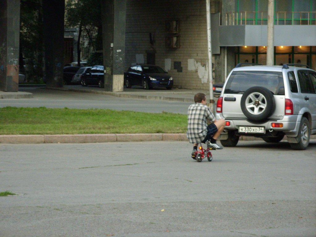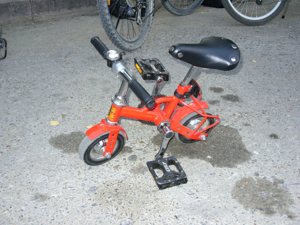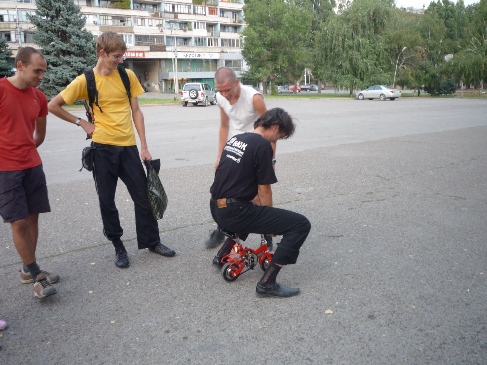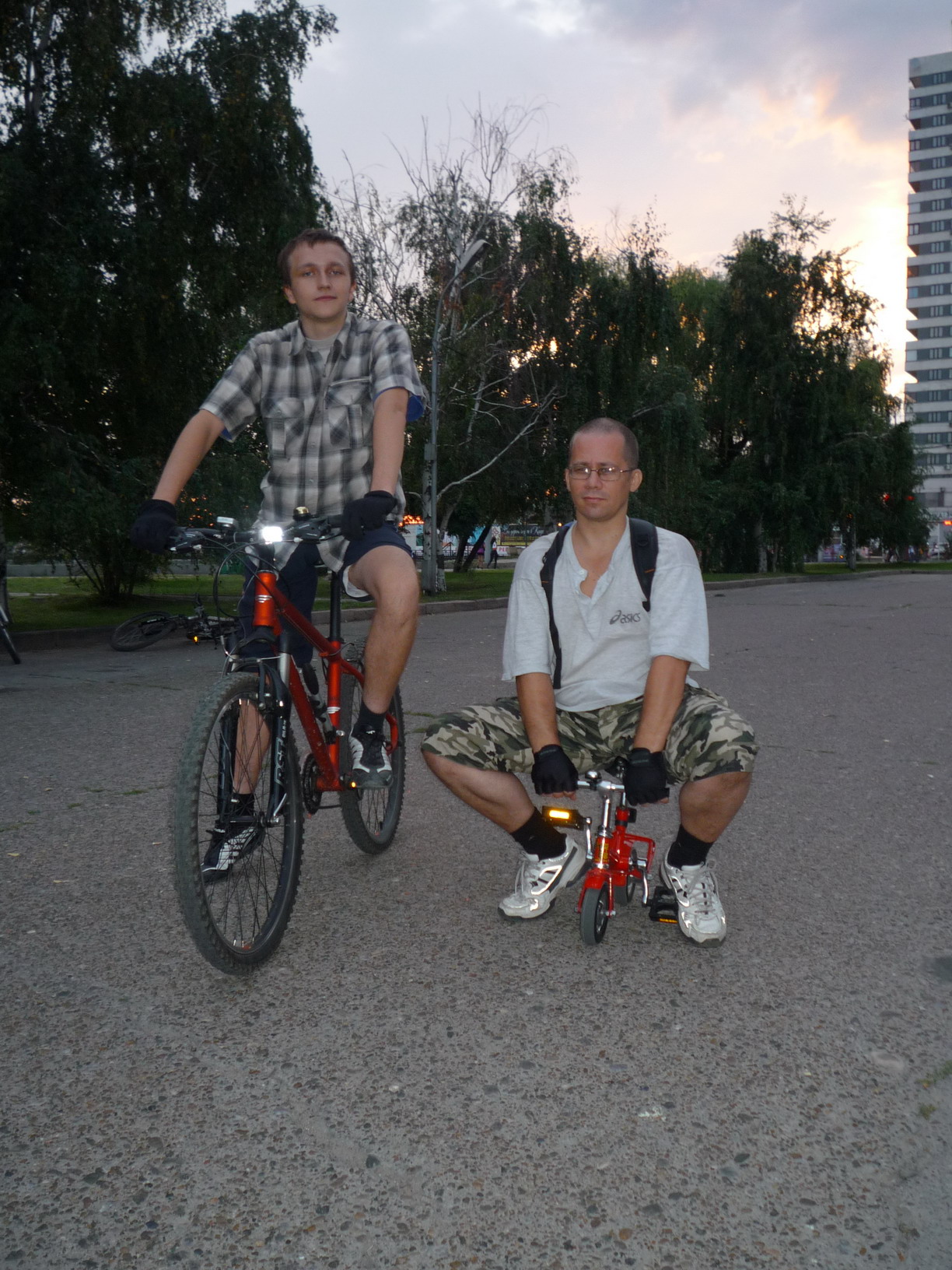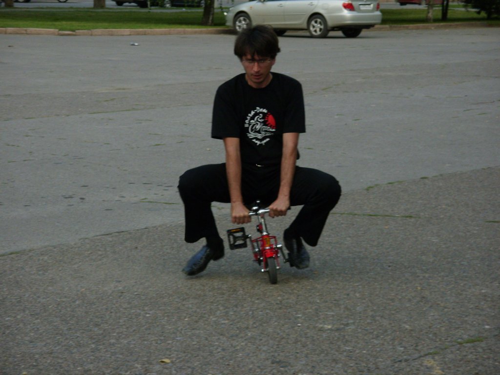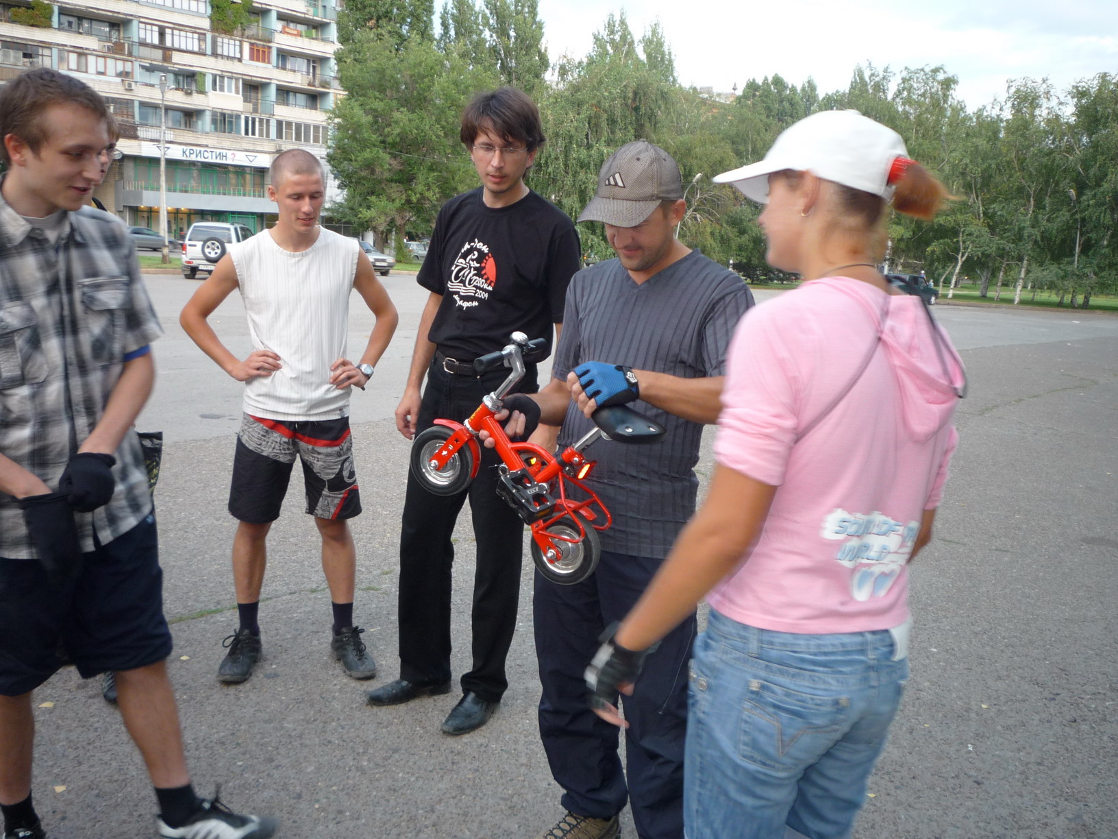 Ну почему же?! Мы втроём с LightSide поехали (сильно сказано) к BMX-ам, показать творение немецких инженеров. BMX-ры оказались не очень любопытными, несмотря на то, что микровелосипед кружил у них под ногами. Но вот роллеры это что-то: облепили его со всех сторон и фоткали его прям на ходу. Одна девушка даже пыталась схватить LightSide за спину, видать, чтобы проехаться. В итоге измученный водитель мини-байка устал и пытался за меня зацепиться, чтобы я его немного повозил и всю дорогу просился на кресло на велик моей девушки. Прохожие, при виде этой чудо-техники, не скрывали улыбок и фоткали его кто на телефон, а кто на фотик. Вобщем полный аншлаг Попробуем проехаться?! Сам мини-байк: Часть собравшихся: