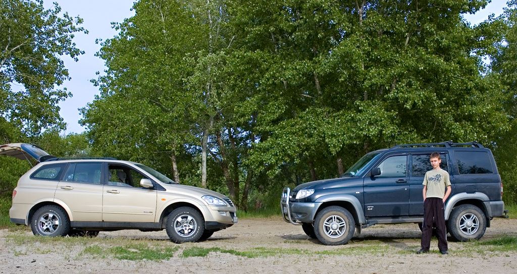 Геометрическая проходимость у патриота превосходная - гораздо лучше чем у кайрона. Достаточно посмотреть на фото. Неразрезной мост спереди позволяет быстро ездить по здоровенным кочкам без опасения приложится бампером или картером - в таких ситуациях я отставал, на трамплинчиках кайрон имеет обыкновение клевать тяжелым "носом", поэтому преодолевать их нужно неспешно. А вот по пескам или на крутой подъем кайрон идет увереннее патриота - просто потому что мотор и понижайка более тяговитые. Бензиновые моторы на патриотах и хантерах для бездорожья плохо приспособлены - на маленьких скоростях мотор не тянет, а прибавишь газу - букс и закапывание. Да и дизеля на уазах хоть и получше но все равно дохловаты. Поэтому там где уаз едет только "с разбегу", кайрон спокойно ползет.