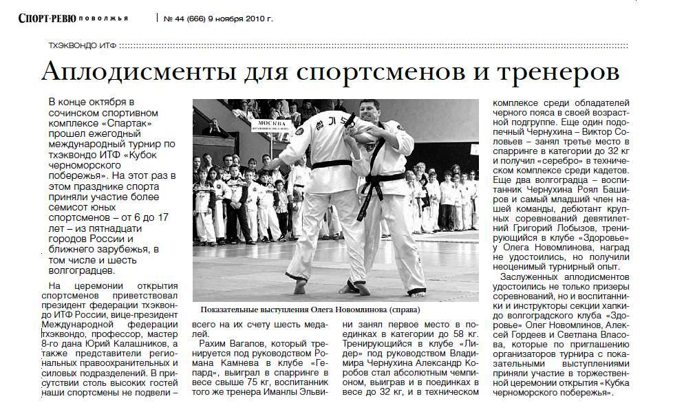 "Кубок Черноморского побережья" по тхэквондо ИТФ (отчёт) 29-31 октября в Сочинском спортивном комплексе «Спартак» прошёл ежегодный международный турнир по тхэквондо ИТФ «Кубок Черноморского побережья». Более 700 юных от 6 до 17 лет спортсменов из 15 городов России и Ближнего Зарубежья приняли участие в этом празднике спорта. Волгоград представляли 6 спортсменов, это Вагапов Рахим и Иманлы Эльвин воспитанники Камнева Романа из клуба «Гепард», Баширов Роял, Коробов Александр и Соловьёв Виктор воспитанники Чернухина Владимира из клуба «Лидер» и самый младший участник Лобызов Григорий, ему только 9 лет и это первые крупные соревнования в его спортивной биографии, воспитанник Новомлинова Олега из клуба «Здоровье». Организаторы турнира, будущей столицы зимних Олимпийских игр, потрудились на славу, расселив участников соревнований в прекрасном и знаменитом отеле «Жемчужина». Погода по началу, не радовала гостей, весь первый и начало второго дня моросил дождь, но уже к концу второго дня показалось солнышко и курортный город заиграл всеми экзотическими красками. На церемонии открытия спортсменов приветствовал Президент Федерации Тхэквондо ИТФ России, вице-президент Международной федерации тхэквондо, профессор педагогических наук, Мастер 8 Дана – Калашников Юрий Борисович. Наши спортсмены показали следующие результаты: Вагапов Рахим занял 1 место в поединках св. 75 кг, Эльвини Иманлы занял 1 место в поединках до 58 кг. Коробов Александр стал абсолютным победителем, заняв 1 место в поединках до 32 кг и 1 место в технических комплексах среди обладателей чёрного пояса в своей возрастной подгруппе. Соловьёв Виктор занял 3 место в поединках до 32 кг и 2 место в технических комплексах среди кадетов. Баширов Роял и Лобызов Григорий не удостоились наград, но вынесли неоценимый опыт таких на будущее. Мы поздравляем победителей и призёров, а так же их тренеров с высокими результатами. Так же в торжественной церемонии открытия соревнований приняли участие инструкторы Волгоградского союза Хапкидо из клуба «Здоровье» - Новомлинов Олег Викторович, Гордеев Алексей Александрович и Власова Светлана Владимировна. Организаторы специально пригласили наших хапкидоков на это мероприятие, оплатив проезд и проживание в международном известном всему миру отеле "Жемчужина". На церемонии открытия спортсменов приветствовал Президент Федерации Тхэквондо ИТФ России, вице-президент Международной федерации тхэквондо, профессор педагогических наук, Мастер 8 Дана – Калашников Юрий Борисович, а так же представители региональных правоохранительных и силовых подразделений.