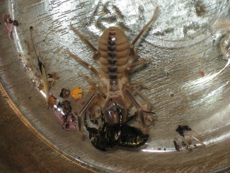 Это паук фаланга, теоретически не ядовит, но ест других пауков, на клещнях остаётся яд. Могут быть достаточно здоровые до 5 см.