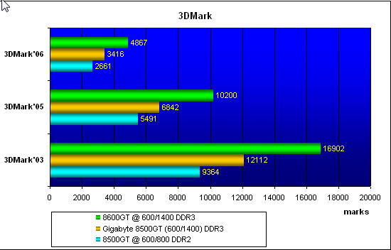 вот почитай http://www.overclockers.com.ua/video/geforce-low-end-7600-8500/ это 8500 с DDR3 добавлено через 2 часа 23 минуты у меня Mark06 дает 3692 попугая